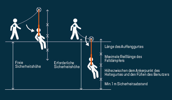 Die Sicherheitshöhe ist der erforderliche Abstand zwischen dem Ankerpunkt und der Bodenfläche. Sie ist abhängig von der Position des Ankerpunkts und der gewählten Absturzschutzausrüstung. Die freie Sicherheitshöhe ist der Abstand zwischen der Konstruktion, auf der der Benutzer arbeitet, und dem nächstgelegenen Hindernis. Die erforderliche Sicherheitshöhe ist der Mindestabstand, den ein Benutzer bei einem Absturz zurücklegen muss, ohne dabei auf den Boden oder auf das nächstgelegene Hindernis zu treffen.