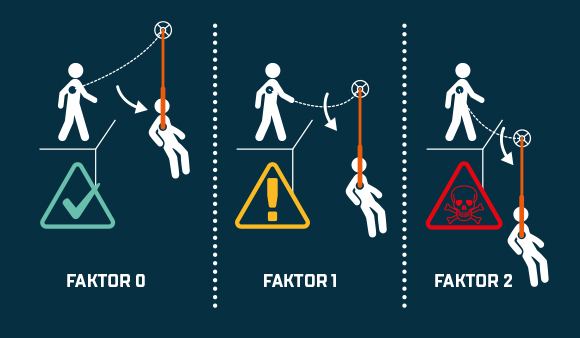 Anhand des Sturzfaktors wird die Intensität eines Sturzes gemessen. Es gibt drei Sturzrisikostufen (0, 1 und 2), die je nach der Position des Ankerpunkts im Verhältnis zur Position des Benutzers berechnet werden. Es empfiehlt sich dringend, den Ankerpunkt über dem Benutzer zu positionieren, um die Aufprallkraft möglichst gering zu halten.