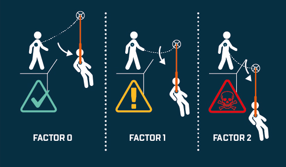 De valfactor geeft de intensiteit van een val aan. Er zijn 3 valfactorniveaus (0, 1, 2) die worden berekend op basis van de positie van het ankerpunt ten opzichte van de positie van de gebruiker. Het is sterk aanbevolen om het ankerpunt boven de gebruiker te plaatsen, om de kracht van de schok te beperken.